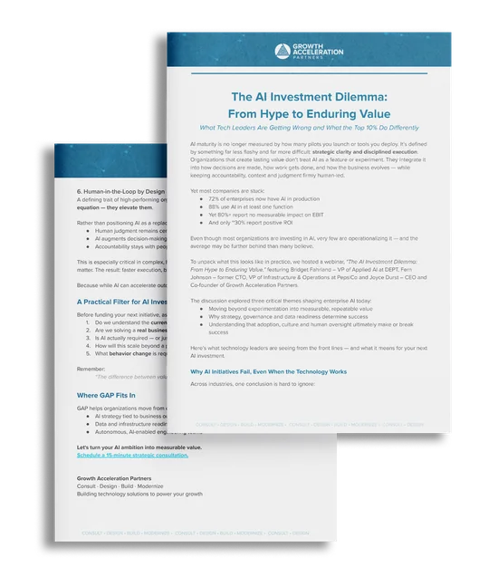 To unpack what this looks like in practice, we hosted a webinar, “The AI Investment Dilemma: From Hype to Enduring Value,” featuring Bridget Fahrland – VP of Applied AI at DEPT, Fern Johnson – former CTO, VP of Infrastructure & Operations at PepsiCo and Joyce Durst – CEO and Co-founder of Growth Acceleration Partners.